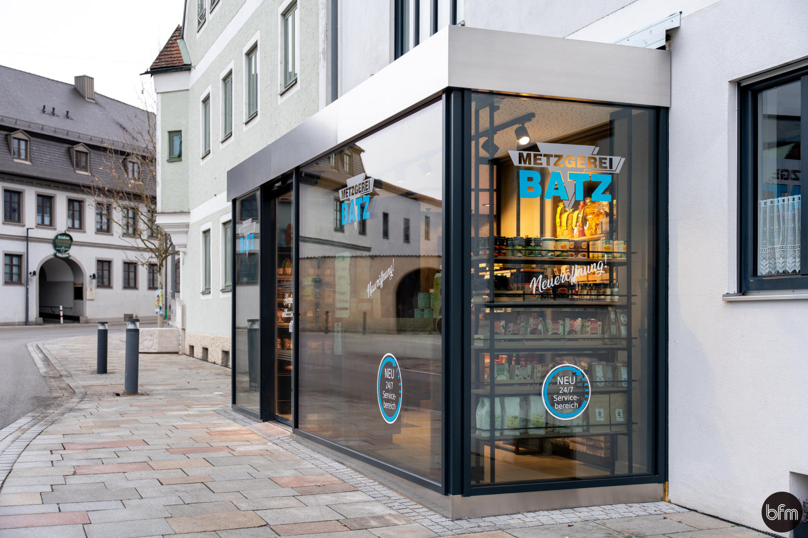 Die Metzgerei Batz steht für höchste Qualität und besten Geschmack. Mit dem Umbau wurde der Laden nicht nur renoviert, sondern um einen 24/7 SB-Shop ergänzt.  Dafür wurde ein stylischer Glaskubus angebaut, der die bisherige Verkaufsfläche um rund 10 m² für den 24/7 Betrieb erweitert. Die flexible Abtrennung zur Abgrenzung des SB-Shops ist hinter dem hinterleuchteten Spannrahmenbild integriert. Perfekte Kühltechnik für langanhaltende Frische und beste Warenpräsentation liefert die Strong Wing Theke. Zusätzliche Umsatzchance bietet eine Imbiss-Zone. Die vielen Holzfronten an Wand und Theken sorgen für eine ansprechende Atmosphäre. Eine Echtstein‑Dekorwand mit Glitzereffekt und das goldfarbene Logo sind echte Eyecatcher und unterstreichen den hohen Qualitätsanspruch.